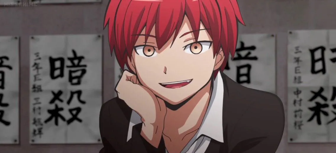 " Wao~ hết nhảy lên nóc xe hơi rồi đến phá tan 3 cái xúc tu của lão bạch tuộc giờ lại đến chĩa dao thật vào tên đầu vàng. Học sinh mới- san còn gì chưa show ra không?"_ Karma nói với giọng thích thú.
