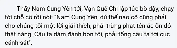 "Đừng đánh nữa, đừng đánh nữa, tôi hứa với cậu là sau này tôi không làm bậy nữa. Còn chuyện đổi trẳng thay đen là do bà ta nghĩ ra, không liên quan gì đến tôi. Đừng đánh tôi nữa..."