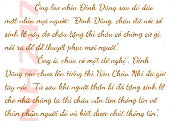 “Có lẽ mọi người cũng đều nghe nói có người tặng sính lễ cho nhà họ Hàn rồi phải không ạ?”, Đinh Dũng nói đầy ý tứ rồi đảo mắt một lượt nhìn mọi người, cuối cùng nhìn về phía Hàn Thành Văn và Hàn Châu Nhi, lãnh đạm nói tiếp: “Không phải mọi người đều muốn biết người thần bí tặng sính lễ là ai sao?”