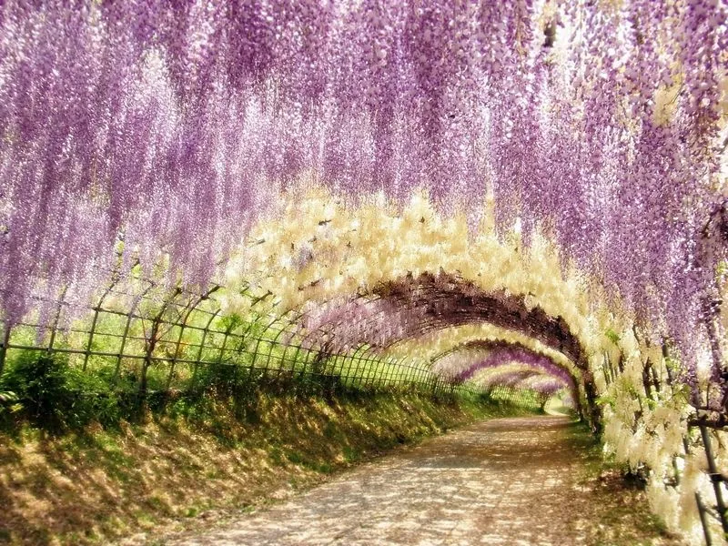 Hàng nghìn hàng vạn hoa tử đằng tím rủ xuống trải dài hơn 80m trông như một căn hầm thu nhỏ được làm bằng hoa vậy. Những bông hoa mềm mại, mỏng manh bồng bềnh như những áng mây, trải dài thành một thảm hoa ngút ngàn, như đang lạc vào chốn bồng lai tiên cảnh, thơ mộng, ngất ngây. Vườn hoa tử đằng trải rộng trước mặt không khác gì xứ sở cổ tích giữa đời thực, nơi đây trở nên tràn ngập hương sắc như một bức tranh phong cảnh tuyệt đẹp.