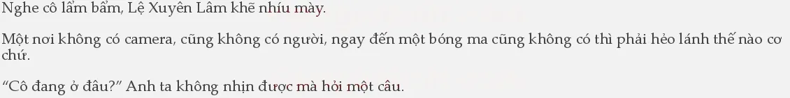 3��Tôi á, tôi ở...” Nhiếp Nhiên nhìn vào góc tối âm u của con hẻm nhỏ, cô đang không biết nói thế nào với Lệ Xuyên Lâm thì lại vô tình nhìn thấy một bóng dáng quen thuộc. Nhiếp Nhiên chăm chú nhìn bóng dáng ấy.