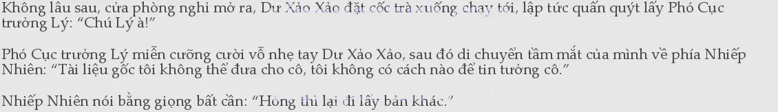 Người bảo thủ mà tỏ vẻ như thông thái ấy làm Nhiếp Nhiên tức đến nỗi chạy đến trước mặt ông ta. Lệ Xuyên Lâm sợ cô lại làm điều gì khác thường lập tức đứng trước mặt của Phó Cục trưởng, cau mày quát cô, “Nhiếp Nhiên!”