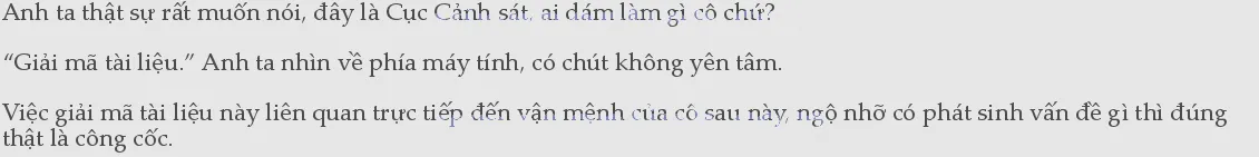 Hai người chạy tới chạy lui ở hành lang Cục Cảnh sát. Nhiếp Nhiên không hề để ý đến Lệ Xuyên Lâm - người đang để tâm trí ở tài liệu đang nằm ở phòng Điều tra mật mã, hỏi: “Cục Cảnh sát các anh có hệ thống làm nhiễu sóng không?”