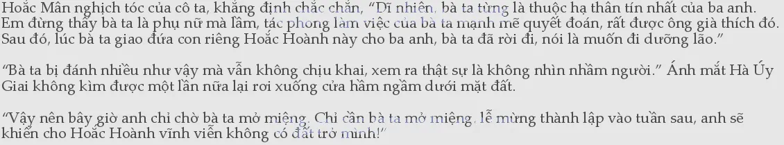 1iện tại, trong lòng Hoắc Mân tràn ngập ý nghĩ muốn lật đổ Hoắc Hoành, hầu như không để ý tới lời của Hà Úy Giai. Hà Úy Giai rất nhanh thu lại thần sắc, khôi phục lại dáng vẻ dịu dàng, “Có điều, anh vẫn nên đề phòng bà ta một chút, tốt nhất là tóm thêm vài người nữa, nhân chứng nhiều rồi, em nghĩ Hoắc Hoành có miệng cũng khó mà cãi.”