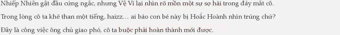 Nhiếp Nhiên ở trong phòng đang nghĩ làm thế nào để tránh xa Hoắc Hoành một chút trong bữa tiệc, sau khi nghe thấy Vệ Vi gọi, lập tức định thần, đáp lại, “Sắp xong rồi, ra ngay đây.”