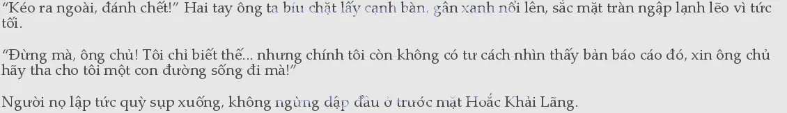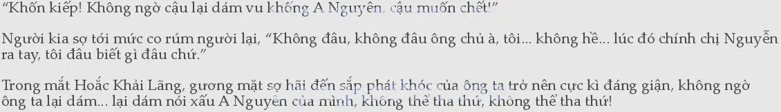 1hưng Hoắc Khải Lãng nào còn nghe nổi lời nào nữa. Trong cơn tức giận, ông ta cầm lấy cốc nước ném thẳng lên đầu người kia. Chiếc cốc thủy tinh vỡ choang tại chỗ, mảnh thủy tinh cứa lên thái dương người đàn ông, máu cũng theo đó ứa ra. “Đánh chết, có nghe thấy chưa! Đánh chết hắn cho tôi! Lại dám vu khống A Nguyên, đáng chết!” Ông ta cảm thấy khó thở, bởi vì tức giận nên ngực phập phồng.