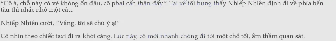 Dễ dàng tránh thoát được mấy bảo vệ1tuần tra, cô đã đến sát khu vực trung tâm của hải cảng. Bấy giờ, cô mới hiểu được tại sao trong này lại có ít bảo vệ tuần tra như thế.