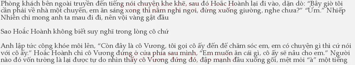 “Buổi trưa tôi lại qua đây, em ngoan ngoãn ở nhà dưỡng thương nhé.” Hoắc Hoành nói chuyện như nói với trẻ con, Nhiếp Nhiên nghe mà trợn mắt lên Nói xong, anh dặn cô Vương mấy câu xong rồi vội vàng rời đi