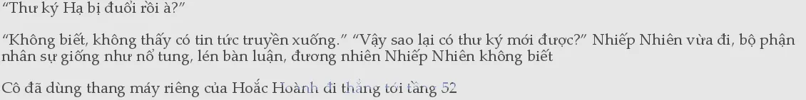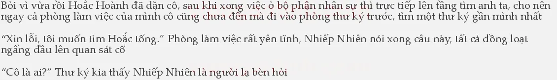 1ó thể tới gặp Tổng giám đốc đều không phải là người bình thường, cho nên bọn họ cần hỏi rõ rồi mới quyết định Nhiếp Nhiên bình tĩnh trả lời: “Tôi là thư ký mới.” Mọi người nghe thấy hóa ra chỉ là thư ký, vậy mà còn làm ra vẻ thần bí, cao cao tại thượng