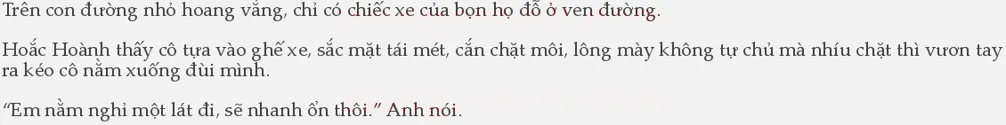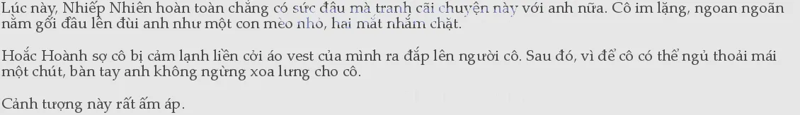 Hoắc Hoành nhìn thấy hết, cảm thấy trái tim như bị xoắn lại, không ngừng an ủi cô, bảo cô hãy cố gắng. Nhưng lúc này, Nhiếp Nhiên chẳng có sức mà gật đầu, chỉ nhắm nghiền mắt không nói gì.