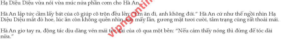 “Bọn họ nói tóc dài sẽ đẹp hơn.” Hạ Diệu Diệu nhai thức ăn, không ngẩng đầu lên, mắt rũ xuống mang tâm trạng chỉ có mình mới hiểu: “... Để tóc dài cho anh xem mà...” Khóe môi Hà An dần dần nở nụ cười, tâm trạng buồn bực kìm nén mấy ngày nay đã tiêu tan, thần thái thoải mái vui vẻ: “Kẹp tóc đâu? Sao không cài.” “Tặng Tiểu Ngư rồi.” Ăn hai miếng, lại lặng lẽ ngẩng đầu lên: “Em ấy cướp đấy! Cũng tại anh, rất có mắt chọn quà tặng.” Hà An đột nhiên được khen ngợi ở lĩnh vực mình vốn không hề có năng khiếu, nụ cười càng vui vẻ hơn: “Đúng lúc có cơ hội để đổi cái mới, nhớ giúp anh cảm ơn em gái em.”