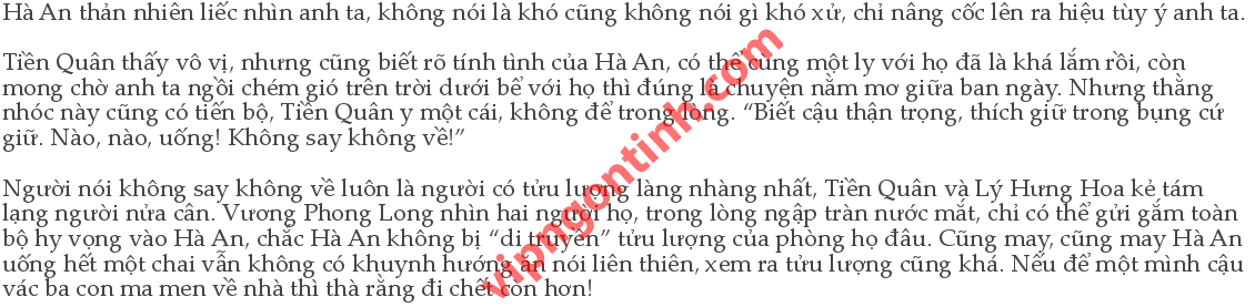 Nhưng sự thật chứng minh Hà An dù có tửu lượng tốt thì cũng không trông cậy được, không thể mong chờ Hà An giúp anh ta chia sẻ gánh nặng hai con ma men này.Tám giờ rưỡi tối, một mình Vương Phong Long cật lực kéo hai tên ma men còn đang la lối om sòm đi ra khỏi quán, chỉ có ký túc xá bọn họ mới sáng lập ra kỷ lục nửa tiếng giải quyết xong một lần liên hoan. “Uống, uống tiếp đế!”. “Phục vụ đầu tiếp rượu đê!” “Câm miệng hết đi!” Còn thấy chưa đủ mất mặt hay sao, Vương Phong Long kéo người này lỗi người kia. “Sao phục vụ lại là nam thể này? Nữ đâu rồi? Gọi nữ ra đây cho tôi!”