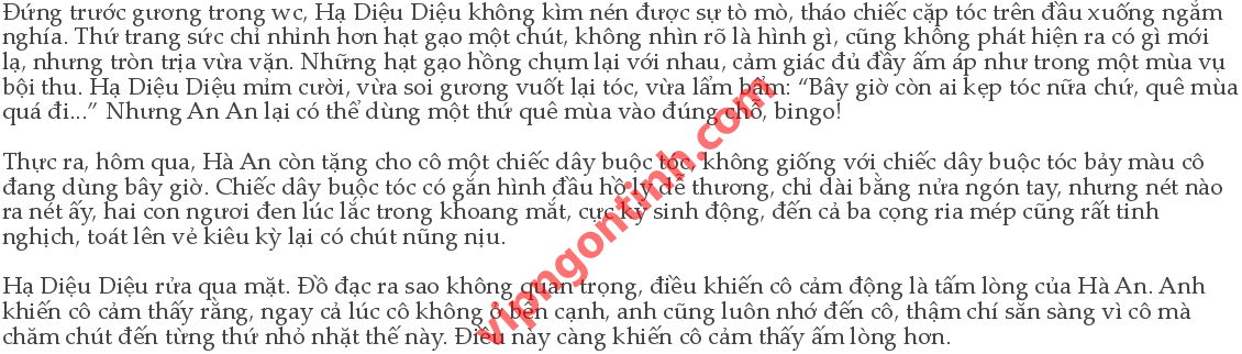 “Mau đi đi! Nếu Hạ Diệu Diệu không định đạp xe đến trường Trung học Số Ba, thì anh không mang họ Hà. Hạ Diệu Diệu bước đi vài bước, quay vội đầu lại: “Nếu anh không muốn đi làm ở KFC,... thì có thể không... Hà An lạnh lùng: “Không sao.” Hà An! Em yêu anh! “Em dâu đi đâu mà vui vẻ thế! Cậu còn đi ăn xiên nướng không đấy. Này, đừng đi vội thế.”