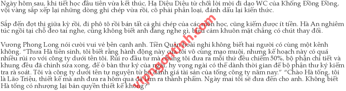 Hà An đưa mắt nhìn về Hạ Diệu Diệu, thấy cô đang cúi đầu, bàn tay hí hoáy cầm bút, chuyển hết dòng này đến dòng khác, ánh mắt anh dần trở nên dịu dàng. “... Cậu thấy có buồn cười không! Thật không thể tin nổi!”
