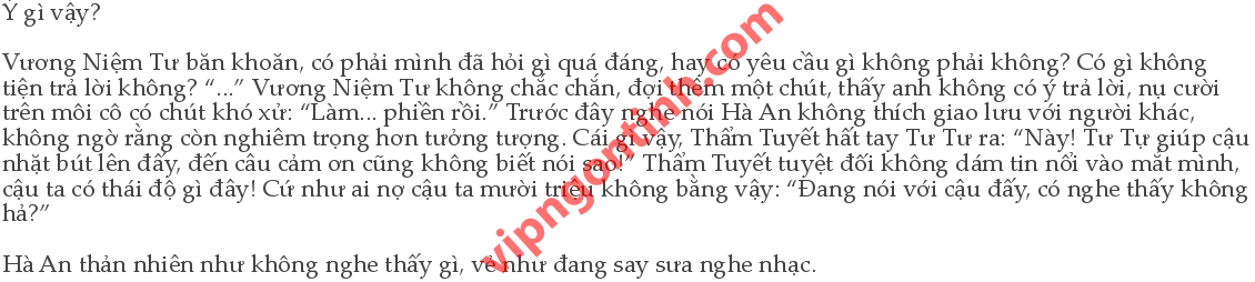 Vương Niệm Tư bỗng nhiên rất băn khoăn bồn chồn. Cô tự nhận thấy lúc nãy mình không có chỗ nào sai cả, sao cậu ta có thể...