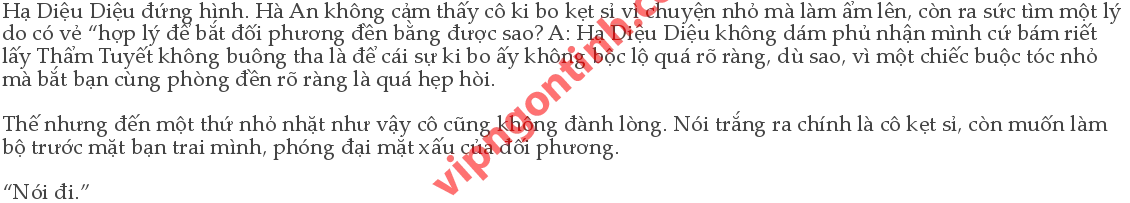 Hà An lạnh lùng đính chính lại ý mình hồi nãy: “Anh sợ em ngại mở lời, bạn cùng một phòng, về sau còn nhìn mặt nhau kiểu gì. Em cứ nói với cô ta, chuyện này không liên quan đến em bảo cô ta đưa cho anh là được.” Hạ Diệu Diệu nguy hiểm nhìn Hà An: “Anh không thích cô ta thật chứ!” “.” Không thèm để ý đến em. “Chỉ yêu một mình em!”