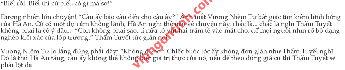 Vương Niệm Tư nghiêm nghị nhìn cô ta, nói rõ ràng từng chữ một: “Bởi vì chiếc buộc tóc đó cậu không đền nổi đâu!” “Tớ không đền nổi!... Tớ không...” Thẩm Tuyết phát điên lên mất! Chỉ là một chiếc buộc tóc rởm mà thôi! Nhưng bị ánh mắt nghiêm trọng của Vương Niệm Tư khiển cho càng ngày càng mất tự tin, do dự nói: “Có gì... không bình thường sao...”