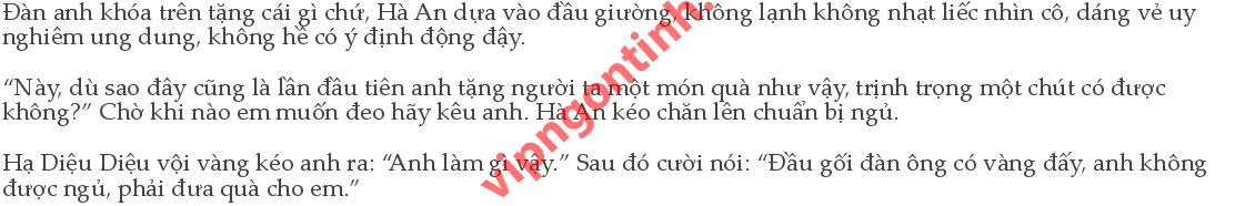 Sắc mặt Hà An vẫn không đổi tỉnh bơ kéo tay cô tiếp tục cài chốt. Hạ Diệu Diệu rút tay lại. Hà An nhìn cô, ánh mắt sâu thẳm còn mang theo ý tứ lạnh lùng: Em có đeo hay không! Hạ Diệu Diệu nhìn trái ngó phải: “Thực sự không thể nào long trọng không hơn một chút được à...” Có gì đâu chứ, chủ nghĩa đàn ông gia trưởng.