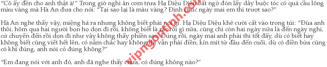 “Đúng, thi xong em về nhà luôn à?” Hà An tao nhã lau miệng, không ăn nữa. “Ừm.” Hạ Diệu Diệu vẫn tiếp tục gắp đồ ăn. Ánh sáng mặt trời bên ngoài không hề ảnh hưởng đến khẩu vị của cô: “Thi xong là bốn rưỡi, vừa kịp bắt chuyển xe đường dài cuối cùng, khoảng chín giờ tối là về đến nhà.” “Như vậy có phải quá muộn hay không.” “Hạ Vũ đi đến bến xe đón em.”