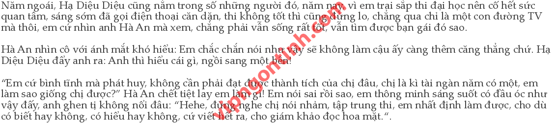 Hà An đứng bên cạnh cửa sổ, vần và cây xương rồng đang ngắc ngoải, lòng thầm nghĩ, nếu anh tiếp tục tưới nước nửa tháng nữa thì cái cây này có chết được không? Hà An đang nghiêm túc suy nghĩ xem, rễ của cây đã mục thối hết chưa. Hạ Diệu Diệu đã cúp máy, đang đi vào nhà vệ sinh, thấy anh đang nhìn chằm2chằm vào món quà kì quặc nhất mình từng có, liền dừng lại: “Anh nhìn nó làm gì? Thích à, nhưng em thấy nó càng ngày càng cằn cỗi xơ xác, ai cũng bảo loại cây này sống dai, em chỉ thấy nó đúng là sắp chết đến nơi, xem ra lời đồn chưa chắc đã là thật.” Nói rồi, cô đi tiếp vào nhà vệ sinh. Hà An thấy cô đi khuất rồi, mới lẩm bẩm một mình, vẫn gật đầu tỏ vẻ nghiêm túc như thường, Diệu Diệu cũng nói sắp chết rồi, vậy thì đúng là sắp chết thật rồi.