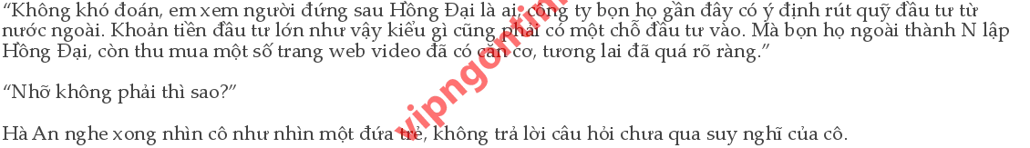Hà An thản nhiên gập tài liệu lại, ăn cơm, dùng hành động để nói cho ai đó hiểu, cổ can thiệp quá sâu rồi. “Sau này, em đi phỏng vấn, anh quay phim. Haha, để anh cũng nếm thử sự vất vả mà hè năm ngoái em phải chịu, mệt chết em mất, thịt bò hôm nay rất mềm. Tết dương lịch đáng ghét, lại qua một năm, em lại sắp thêm một tuổi rồi.”