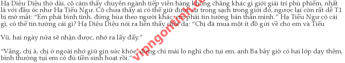 Hạ Diệu Diệu ừ vài tiếng, cũng chỉ nghe thể thôi, Hạ Vũ cô không lo, Hạ Vũ có thể tiêu tiền gì chứ, chỉ có Hạ Tiểu Ngư, ngành hàng không nhất định sẽ tốn tiền ăn tiền uống tiền mắc hơn, tuy cô biết so sánh như vậy là không đúng, nhưng cô cũng không muốn để Tiểu Ngư chịu uất ức. Dù Hạ Vũ có ý kiến với Tiểu Ngư thì phương diện này cũng sẽ nhẫn nhịn, đa phần tiền lương có lẽ đều đưa cho cô. Haiz, dù sao cũng là em gái mình, mọi người dĩ nhiên sẽ thương yêu: “Không nói với em nữa, nhớ là phải biết suy nghĩ một chút, đừng có yêu đương lung tung.” “Biết rồi biết rồi.”