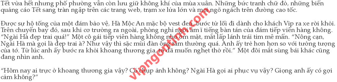 Phó Khánh Nhi ngẫm lại: “Cảm giác thở không nổi. Anh ta không phải là người bình thường dễ gần. Ở đẳng cấp của anh ta ai cũng có gương mặt rất lạnh lùng, đáng sợ. Đó8chính là nguyên nhân vì sao người ta nói gần vua như gần hổ vậy. Các em tưởng họ sẽ bị sắc đẹp làm mê hoặc mà yêu các em à? Như vậy các em quá xem thường vị này rồi. Thôi lo làm việc đi, sau này được làm ở khoang hạng nhất, nói không chừng lúc đó các em có thể lĩnh hội được công lực lạnh lùng của Ngài Hà.”