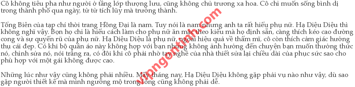 Hạ Diệu Diệu cảm thấy cực kỳ may mắn vì sau ba tuần bị điều đi, tạp chí đã đăng bài: “Sắc đẹp phương Đông trong lâu đài cổ”, lấy chủ đề là sự biến đổi, bộ trang phục này vốn chỉ thiết kế phù hợp với chiều cao của người phương Tây, không phù hợp với phong cách đại đa số người châu Á những phiên bản cập cao, thiết kế túi kết hợp với vẻ đẹp của cái mũ mang hơi hướng cổ điển khiến người ta thích thú vô cùng. Hạ Diệu Diệu lấy nó làm đề tài cho kỳ này của tạp chí, đặc biệt đến thăm rất nhiều công ty thời trang, phỏng vấn nhiều nhà thiết kế, đổi ống tay áo thành kiểu ống bánh răng côn thẳng, gợi2ý những bạn thích mặc bộ này nên mua về may vá sửa cho nó lệch vai sang trái, như vậy càng thể hiện được nét đẹp tinh tế của người phụ nữ phương Đông.