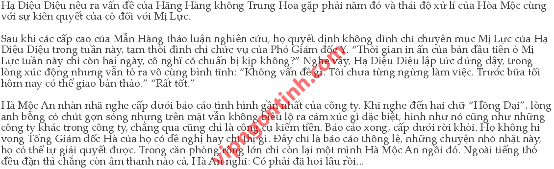 Bằng sự cảm kích, Hạ Diệu Diệu tiễn Trợ lí Bào ra khỏi văn phòng tổng bộ. Đây là người chị lớp trên mà Trạm Vân đã giới thiệu cho cô: “Rất cảm ơn chị. Nếu không nhờ có bản tư liệu chi tiết và rõ ràng của chị cổ vũ, em nghĩ em không dám hành động dứt khoát như vậy.”