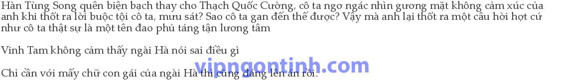 “Tôi chỉ muốn hạ nhục Hạ Diệu Diệu! Tôi chỉ không thích cô ta dụ dỗ Cao Trạm0Vân! Tôi vốn dĩ không biết đó là con gái của anh!” Hà Mộc An vẫn bình tĩnh, cái gì mà dụ dỗ với không dụ dỗ, với nhan sắc của Hạ Diệu Diệu muốn dụ dỗ được ai cũng là cả một vấn đề: “Tôi làm sao biết cô không biết.” “Tôi thật sự không biết! Tôi không biết!” Hàn Tùng Song bịt tai, ra sức lắc đầu, dù có bán đứng Cao Trạm Vần cũng không thể gánh chịu cái tội danh nặng nề như thế: “Cô bé đó rõ ràng là con gái của Hạ Diệu Diệu!”