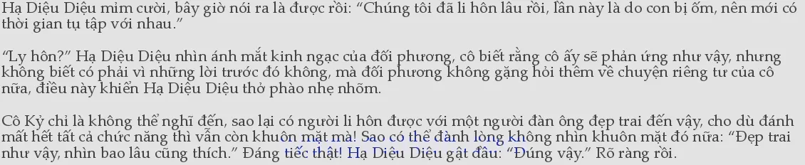 Cô Kỷ thấy vậy thì ngạc nhiên, ghê gớm thật: “Đã từng lấy một người đàn ông như thế này rồi, mà cô vẫn có thể lấy người khác được, giỏi thật.” Hạ Diệu Diệu băn khoăn, đây là kiểu quan hệ nhân quả gì đây.
