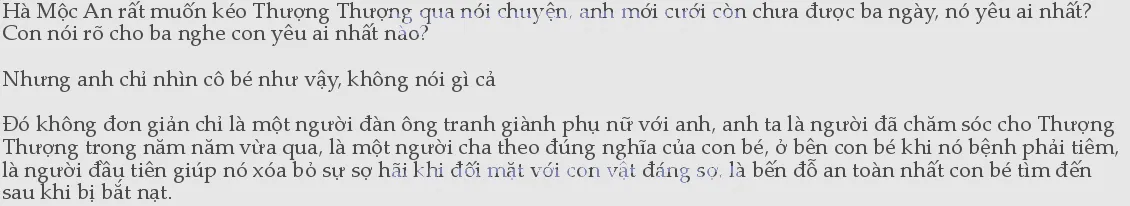 Hà Mộc An tự nhiên thấy ê cả răng, vừa nãy Thượng Thượng gọi như vậy Cao Trạm Vân sẽ nghĩ gì, có phải anh ta sẽ đoán là anh không muốn nhìn thấy anh ta gọi cho con gái, không muốn nhìn thấy Thượng Thượng nói chuyện với anh ta, rồi suy đoán anh là một người nhỏ nhen hay đố kỵ, thật là...