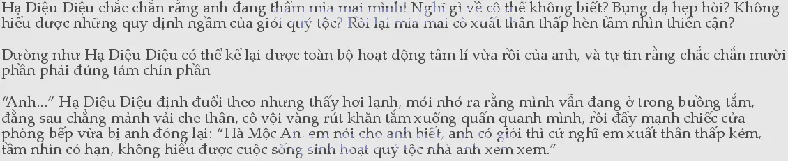 Rồi cô đứng ngoài cửa bếp nói vọng ra: “Ăn gì, em nấu cho anh.” Hà Mộc An nghe vậy, lập tức thấy mình như phát điên lên được, thật nực cười vì anh đã nghĩ cô đang ghen, không muốn anh ăn đồ ăn thừa của người khác, thế nên anh bắt đầu hơi khó xử, chắc chắn anh nên đi kiểm tra sức khoẻ mới được: “Mì gà..