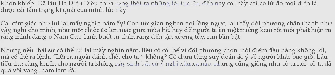 Nếu không phải vì lí trí vẫn còn, thì chắc cái tâm trạng tức tối này cũng đủ để khiến mọi thứ tốt đẹp mà Hà Mộc An làm vì cô tan thành mây khói, cô chỉ còn thấy trong cuộc hôn nhân này, mình chịu thiệt, mình thật tội nghiệp, mình là kẻ bị hại, rồi vì thế mày nảy sinh ra trạng thái tồi tệ hơn bao giờ hết, dường như sẵn sàng vùi dập tất cả những gì anh đã làm trước đó, thậm chí còn muốn li hôn, muốn anh cút xéo ngay lập tức!