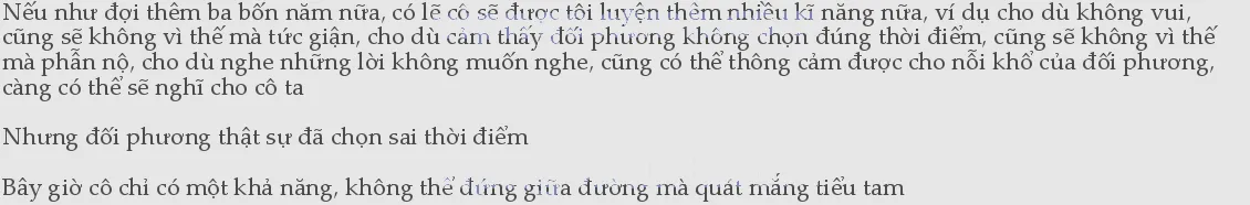 Nhưng, vẫn là câu nói đó, thời cơ không đúng, quá không đúng, cô chỉ mới vừa kết hôn một tháng, một người con gái xuất thân bình thường, những lời nói có hay ho đến đâu, vào tai cô cũng chỉ biến thành vài chữ: muốn leo lên giường chống mình!