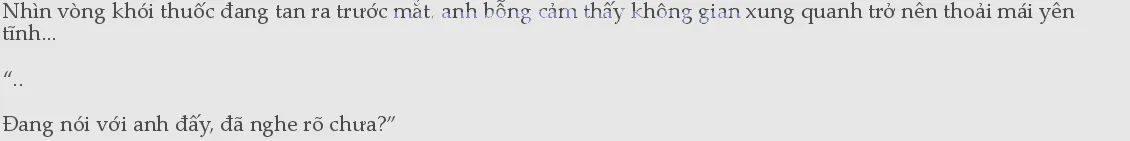 Trả lời làm gì, em không có mắt chắc! Cô đánh răng, rửa mặt, hất nước lên mặt, rồi để khăn lên mặt loa qua, bật nước xả bồn cầu, tinh thần sảng khoái, cầm lấy điện thoại cố định trên tường: “Chị Tần ơi, bữa sáng tôi muốn uống sữa đậu nành, cảm ơn.” Rồi cô nhìn về phía Hà Mộc An, sững người lại