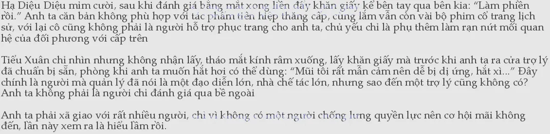 “Trong ngành quen biết nhau là chuyện bình thường, chúng tôi đối với việc hợp tác với anh Tiêu đây vô cùng có thành ý, ngoài hai bộ phim điện ảnh chuẩn bị khai máy, ở đây tôi còn có sáu bộ Phi Diệu có kế hoạch khởi quay trong năm nay, nếu anh Tiểu muốn xem, đó là vinh hạnh của chúng tôi.” Vừa nói xong cô liền lấy ra sáu bộ từ trong túi tài liệu, sáu bộ này đều dùng mực viết máy viết, vô cùng có tính nghệ thuật