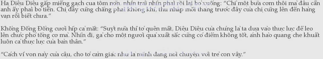 Hạ Diệu Diệu bội phục, chẳng trách bây giờ vẫn loanh quanh vấn đề của lão Thiệu. Về chuyện liên quan đến lão Thiệu này, dù Đồng Đồng là bạn tốt nhưng cô vẫn phải nói, cô ấy quá không quyết đoán, lúc nào cũng băn khoăn do dự, thể3loại đàn ông mà đến việc đường ống thoát nước nhà vợ trước cũng quan tâm thì có gì là tốt chứ!