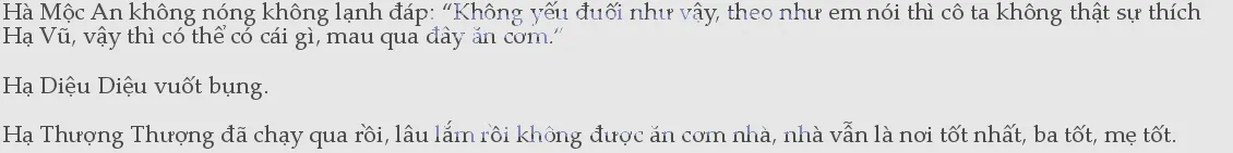 Hạ Thượng Thượng căng thẳng đợi mẹ quay lại, ba lại nhìn về phía sách, cô bé vùi vào lòng mẹ để lấy sự tự tin. Cô bé cũng không biết vì sao mà từ lúc trở về mình cứ thấy sợ ba, rõ ràng vẫn là ba của ngày trước nhưng lúc ba nhìn, cô bé lại đột nhiên cảm thấy lo lắng. Mẹ thì không vậy, mẹ vẫn dịu dàng như trước, mặc dù có lúc cô bé cũng cảm thấy bất lực khi mẹ ôm hôn, nhưng có ba lạnh mặt đứng đó thì cô bé lại cảm thấy mẹ như vậy rất tốt.