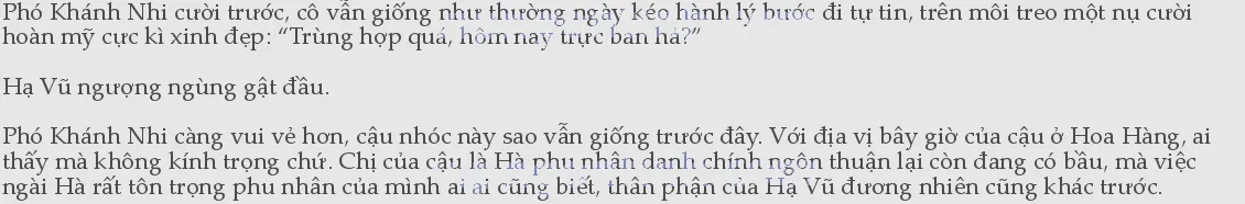 Một câu này đã kéo gần khoảng cách giữa họ. Hạ Vũ càng ngại hơn, việc của cậu có thể người khác không biết nhưng chị Phó thì lại hiểu rõ, cậu không nhịn được mà nhỏ giọng oán trách: “Hoàng tổng đi dự họp cuộc họp quan trọng, em đi thì còn ra thể thống gì nữa...”