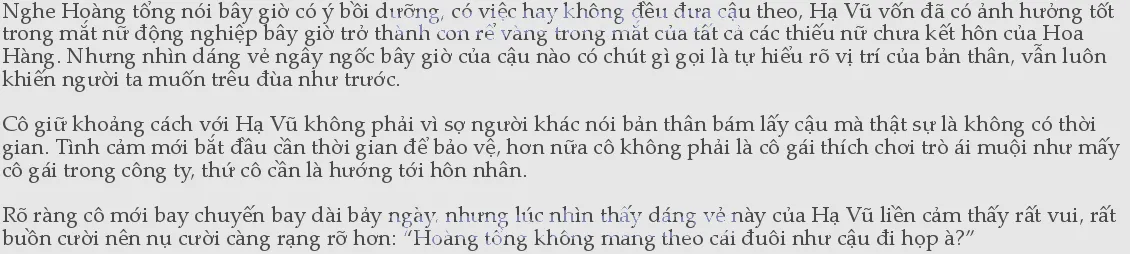 “Nghe ý của cậu thì Hoàng tổng thật sự có ý cho cả cậu đi?” Phó Khánh Nhi cười càng vui vẻ hơn, Hoàng tổng là người có nguyên tắc như vậy mà liên tục phá lệ vì Hạ Vũ. Chắc là vì Hà phu nhân rất thánh thiện, thêm việc Hạ Vũ cũng thành thật chăm chỉ, ngài Hà cũng thích mới như vậy, rất tốt, thanh niên mà, tiền đồ rộng mở.