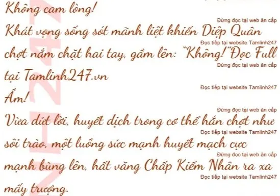 Diệp Quân lại bị đá bay ra xa mấy chục trượng nữa. Chấp Kiếm Nhân chưa chịu dừng tay, nàng ta tiếp tục xông tới, tay đấm chân đá, khiến Diệp Quân liên tục hộc máu. Nàng ta vừa đánh vừa mắng chửi: “Đánh chết ngươi! Đánh chết ngươi, gã đàn ông thối tha…”