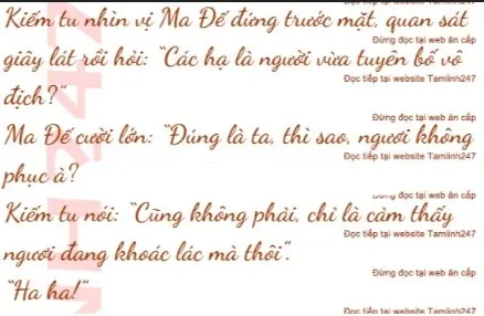 Đúng lúc này, Ma Đế chợt cất tiếng cười to: “Cuối cùng cũng có một kẻ chẳng đến nỗi yếu lắm, các vị chớ có nhúng tay, để ta đi lấy đầu hắn về đây”.