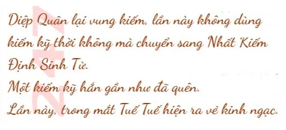 Tuế Tuế cười: “Kiếm thế đã thay đổi, nhưng không có nghĩa là ngươi đã tiến bộ. Muốn đánh bại ta là phi thực tế, nhưng đây cũng là một khởi đầu tốt, khi ngươi nhận ra kiếm đạo của mình còn thiếu những gì. Kế tiếp cứ không ngừng tôi luyện để phát triển, xây dựng nền tảng của mình”.