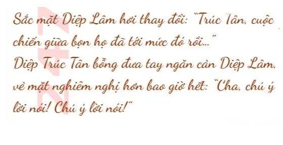 Diệp Trúc Tân nghiêm túc nói: “Từ bỏ hết tất cả, từ nay về sau nếu con cháu nhà họ Diệp muốn vươn lên thì phải dựa vào khả năng của mình để phấn đấu”.