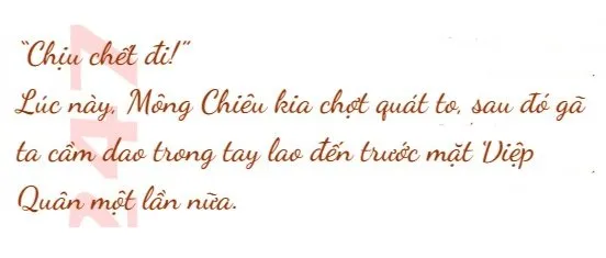 Mà vào lúc bị đánh bay, Mông Chiêu phía xa chợt bay tới trên đầu Diệp Quân, trong tay gã ta không biết xuất hiện một con dao màu đen từ bao giờ, cùng lúc đó, bản thể của gã ta cũng đã hồi phục, gã ta cầm con dao bằng hai tay chém về phía Diệp Quân.