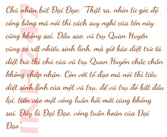 Nói rồi, ông ta thoáng ngập ngừng rồi mới tiếp lời: “Trong văn minh vũ trụ cao cấp, khi có tu vi quá cao thì tu sĩ sẽ bị ràng buộc. Ví dụ như Cửu Châu Chủ chẳng hạn, khi ông ta động tinh thần để làm một việc gì đó, nếu việc ấy phá hỏng trật tự của trời đất thì sẽ vi phạm quy định của tổ đạo. Tổ đạo sẽ cấm ông ta lom vậy, nếu ông ta vẫn cố chấp làm thì sẽ gặp kiếp nạn. Nhưng nếu trời đất xuất hiện tình trạng trật tự bị phá hỏng và đi ngược với tồn tại của tổ đạo, tổ đạo sẽ âm thầm giao nhiệm vụ cho ông đi xử lý. Ông mà làm được thì sẽ nhận được lợi ích lớn”.