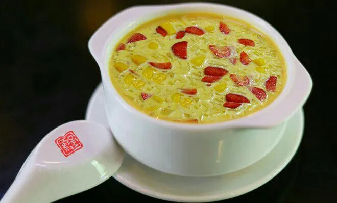 (P/s: nước cốt được làm từ xoài và sữa kem béo, vừa có vị ngọt ngọt chua chua của xoài vừa có mùi thơm nhẹ và vị béo của sữa, ăn kèm với bưởi và dưa hấu. Vẫn là chè hoa quả nhưng đặc biệt hơn.)