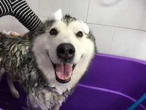 Trương Tú Lệ đưa Nhụy Bạch Y đi vào xem. Cô thấy một con chó Husky tai cài bông hoa nhỏ màu hồng, trên đầu có bọt, lông toàn thân ướt rượt dính dấp đứng trong đấy.