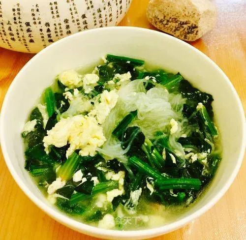 Sau khi cắt nhỏ cải bó xôi thì chần qua với nước nóng cho bớt mùi hăng, đợi nước trong nồi sôi thì cho cải vào, thêm muối, gừng, nước tương, sôi thêm lần nữa thì đổ trứng đã đánh đều vào là xong, món này có thời gian hoàn thành chưa đầy mười phút.